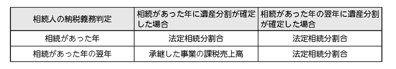 しかしながら、消費税は税の転嫁を予定して立法されているものであり、納税義務の有無については、事前に予知しておかなければ価格設定(税の転嫁)ができない。こういった理由から、相続があった年とその翌年については、次頁の上表のように法定相続分割合により相続人の納税義務を判定することが、大阪国税局と東京国税局の文書回答事例により公表されている。