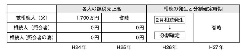 なお、事業承継者である照会者は会社員、その妻は専業主婦であり、相続の発生した平成26年に係る基準期間(平成24年)における課税売上高はゼロである。