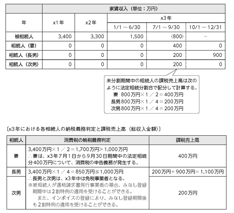 なお、被相続人のx3年1月1日~6月30日期間中の課税売上高1,500万円については、10月31日までに相続人が共同で準確定申告と納税をすることになる(消法45③、59)。