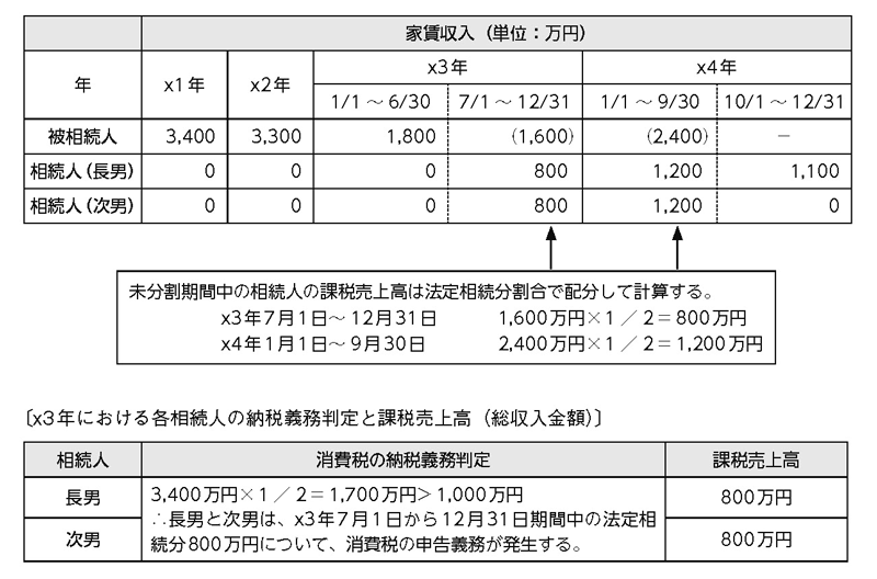 なお、被相続人のx3年1月1日~6月30日期間中の課税売上高1,800万円については、10月31日までに相続人が共同で準確定申告と納税をすることになる(消法45③、59)。