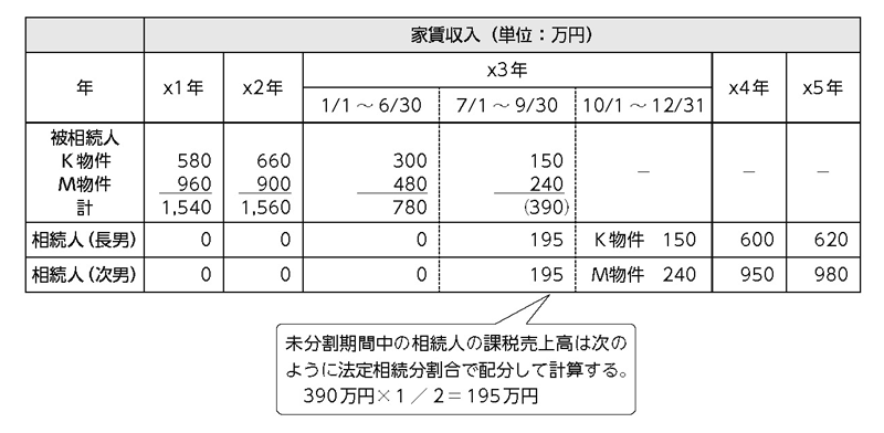 x3年1月1日~6月30日(相続前の期間)については、分割承継によりK物件の賃料収入300万円は長男に、M物件の賃料収入480万円は次男に帰属することになる。