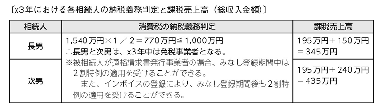 ……が、筆者はx3年分の所得税や消費税の申告で、長男が実際に売上高に計上した金額により判定すべきだと考え、【具体例1】を作成した。