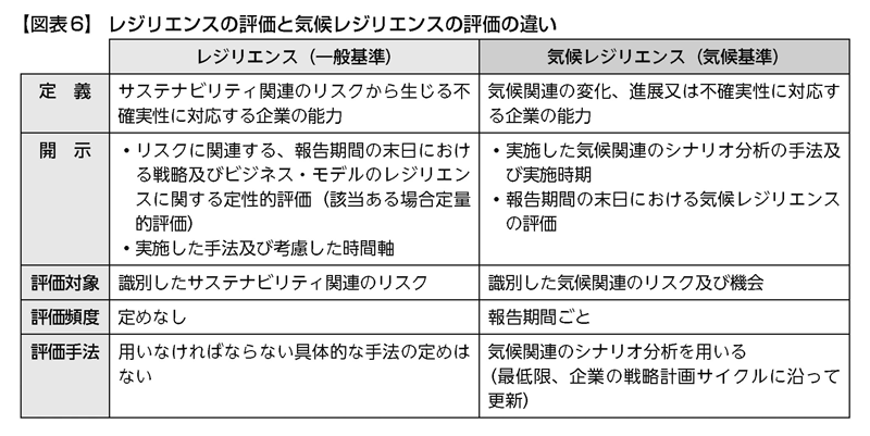 なお、2024年3月に公表した公開草案では、SSBJ基準独自の定めとして、レジリエンスの評価は、原則として、報告期間ごとに実施しなければならないとしたうえで、他のSSBJ基準において具体的な定めが存在せず、かつ、レジリエンスの評価結果について、前報告期間における評価結果と大きく相違しないことが見込まれる場合、前報告期間におけるレジリエンスの評価結果に基づき開示を行うことができるとする定めを追加することを提案していたが、SSBJ基準の内容を可能な限りISSB基準にあわせるため、この定めは削除している。
