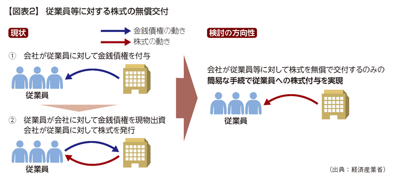 ただし、従業員等は株式の無償交付の対象外であるため、実務上は金銭債権を従業員等に付与した上で、従業員等に募集株式を割り当て、引受人となった従業員等に金銭債権を現物出資財産として給付させることにより、株式の発行又は自己株式の処分をするという取扱いがなされている。このように企業の事務負担等が大きいとの指摘があり、今回の会社法改正では、従業員等に対しても株式の無償交付を可能にする方向で検討が行われる(図表2参照)。