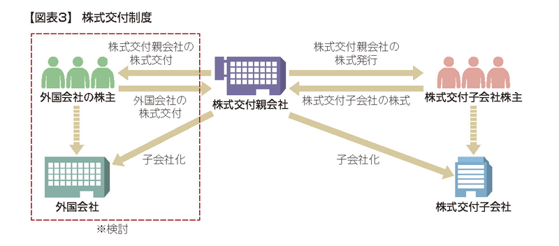 現行の株式交付制度の対象については、国内の株式会社の議決権の過半数を取得する場合に限られており、これ以外に子会社化する場合のほか、外国会社や持分会社を子会社にする場合は対象外となっている。このため、対象範囲をどこまで拡大するかが論点となる(図表3参照)。