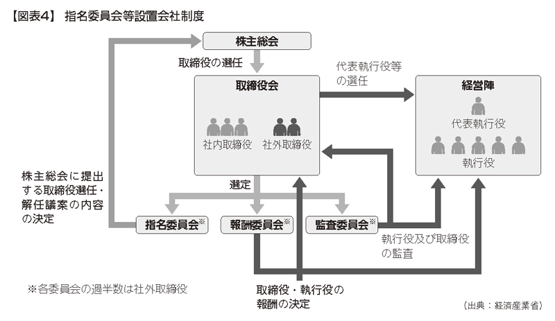 企業統治の在り方等に関して挙げられるのは指名委員会等設置会社制度の見直しだ。同制度は、平成14年の商法改正により導入された委員会等設置会社制度を前身とするものだが、現在まで実質的な見直しは行われておらず、改善を求める声がある。問題は、①各委員会の委員の過半数は社外取締役でなければならないが(会社法400条3項)、取締役の過半数が社外取締役とはされていないことや、②指名委員会は株主総会に提出する取締役選任・解任議案の内容を決定する権限を有しており(会社法404条1項)、取締役会が指名委員会の決定を覆すことができないとされていることだ(図表4参照)。
