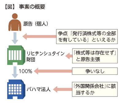 原告(個人)は、リヒテンシュタイン公国に設立した財団を通じてバハマ法人の全株式を保有しており、裁判では当該バハマ法人が原告に係る「外国関係会社」に該当するか否かが争われた。リヒテンシュタインの会社法には財団の株式等に関する定めはないが、東京地裁は、事実関係から、原告が財団の資本金の全額を拠出するなどして本件財団を実質的に設立したことにより、本件財団の自益権及び共益権と同視できる権利ないし地位を全部有していたとして、本件財団の発行済株式等の全部を保有していると判断した。