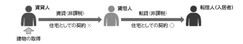 サブリース契約において、賃貸人と賃借人との契約においては物件の用途が明らかにされていないものの、賃借人と転借人(入居者)との間で住宅用としての契約がされている場合には、入居者が住宅として使用することが明らかなので、賃借人から転借人(入居者)への転貸だけでなく、賃貸人から賃借人への賃貸についても非課税となる(消基通6−13−11(2))。