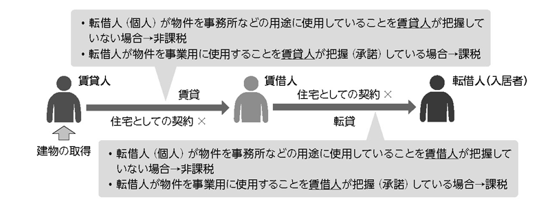 したがって、契約書で物件の用途が明らかにされていない場合であっても、転借人が物件を事業用に使用することを賃貸人が把握(承諾)している場合には、その事実に基づき、課税されることになる。