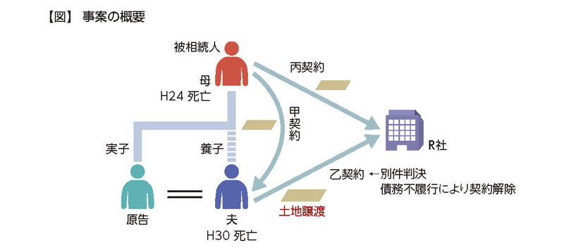 事案の概要は図のとおり。原告の母(被相続人)は、平成23年に原告の夫に複数の土地を譲渡し(甲契約)、原告の夫はR社に当該各土地を含む複数の土地を譲渡した(乙契約)。また、原告の母は、そのほかの土地をR社に譲渡した(丙契約)。その上で原告の母は、甲契約及び丙契約に係る分離長期譲渡所得を含む平成23年分の所得税の確定申告をした。