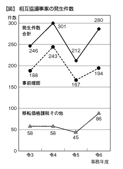 国税庁が11月11日に公表した令和6事務年度の「相互協議の状況」によると、相互協議事案の発生件数は280件と増加(前事務年度比132%)し、このうち事前確認に係るものは194件、移転価格課税その他に係るものは86件(内訳は移転価格課税67件、PE事案や源泉所得税事案等が19件)であることが分かった(図参照)。
