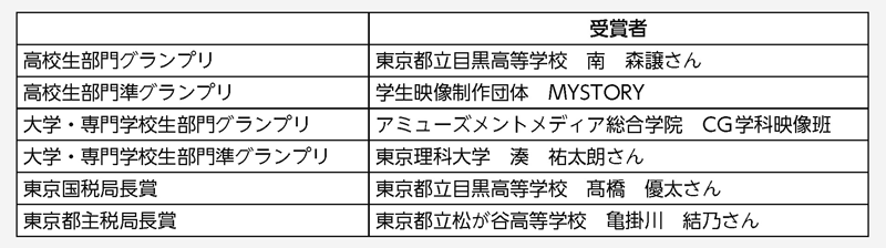 一般社団法人東京青色申告会連合会は11月7日、都内の東京青色申告会館で「第1回税に関する動画グランプリ」の表彰式を開催した。同連合会は、若い世代に未来のための「税」を考えてもらうことを目的として、都内在住・在学の高校生、大学生・専門学生を対象に、「税」をテーマにした動画作品を初めて募集した。応募作品44点の中から各賞の受賞者が選ばれ、各部門のグランプリ・準グランプリには東京青色申告会連合会の相原博会長から、東京国税局長賞の受賞者には小宮敦史局長から、東京都主税局長賞の受賞者には武田康弘局長から、それぞれ表彰状が手渡された。