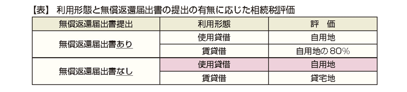 本件質疑によると、上記の通りこれまで「貸宅地」として評価するものと考えられてきた。利用形態が「使用貸借」で「無償返還届出書の提出がない」土地は、「自用地」として評価することとされている(表のハイライトした部分)。