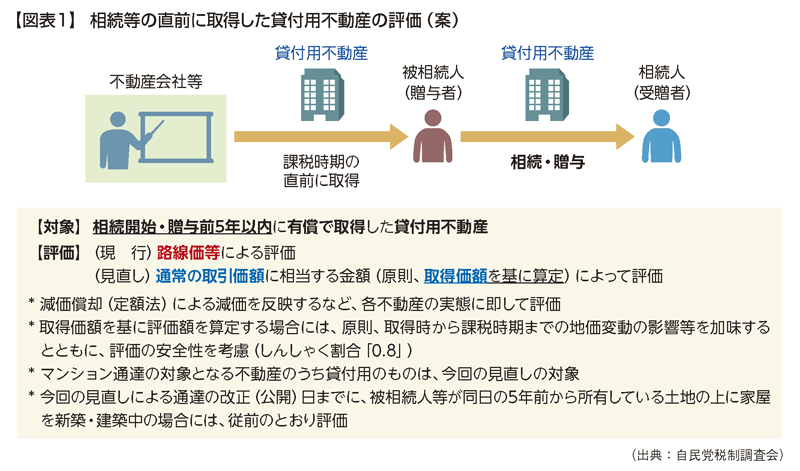 まず、貸付用不動産については、相続開始・贈与前の5年以内に有償で取得したものは路線価等による評価によらず、通常の取引価額に相当する金額によって評価する。原則として取得価額を基に算定することになる(図表1参照)。一棟所有の賃貸用不動産だけでなく、マンション通達の対象となる賃貸用不動産についても対象となる。