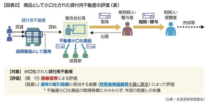 このため、商品として小口化された貸付用不動産については、通常の取引価額に相当する金額によって評価することとする。実際には売買実例価額等を基に算定することになる(図表2参照)。不動産小口化商品の取得時期にかかわらず、今回の見直しの対象となるので留意したい。なお、不動産小口化商品については、信託受益権に係る金融商品取引契約(信託型)だけでなく、不動産特定共同事業契約(任意組合型・賃貸借型)についても対象となっている。
