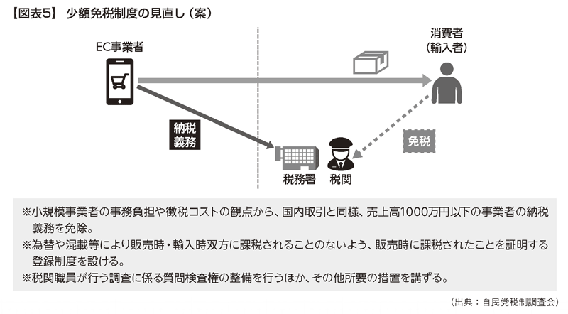 このため、令和8年度税制改正では、①の場合に対応するものとして、少額免税制度の見直しを行う。具体的には、国境を越えて行われる通信販売のうち、1万円以下の貨物は諸外国と同様、販売者に納税義務を課すこととする(図表5参照)。