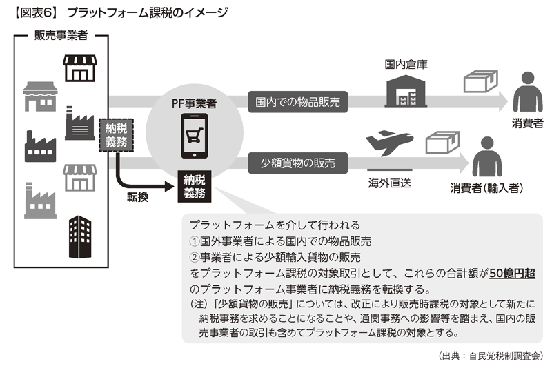 また、主に②に対応するものとして、プラットフォーム事業者に納税義務を転換するプラットフォーム課税を導入する。対象とするプラットフォーム事業者には、高い税務コンプライアンスや事務処理能力が求められることなどを考慮し、プラットフォーム課税の対象となる物品販売の合計額が50億円超のプラットフォーム事業者を対象とし、その納税義務をプラットフォーム事業者に転換する(図表6参照)。