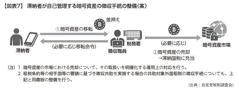 暗号資産の差押えについても、国税当局から課題が指摘されていたものだ。暗号資産交換業者を介して保有する暗号資産については、交換業者に対する債権を差し押さえることが可能となっているが、滞納者が自己管理する暗号資産については、現状では差押えを行うことができないこととされている。このため、令和8年度税制改正では、徴収職員の管理に移す方法により、差押えを行うことができるようにする(図表7参照)。徴収職員が自らの管理に移すことが困難である場合には、滞納者にその暗号資産の移転を命じることができるようにし、移転命令について、正当な理由がなく違反した場合には罰則の対象とする。