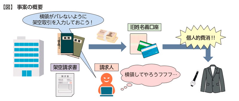1つ目に紹介するのは、請求人が株式会社A社において経理担当者として従事していたX年からY年にかけて、A社の経理業務を一人で担っていた立場を奇貨として、A社の当座預金口座(A社名義口座)から請求人の旧姓名義の預金口座(旧姓名義口座)に送金する方法によりA社から金員を横領していた事例(横領により得た金員は高級腕時計や洋服の購入等に費消)。請求人は、A社の会計ソフトに架空法人に対して製造消耗品費を支払ったとする架空仕訳の入力を行い、架空の請求書及び納品書を作成するなどしていた(図参照)。