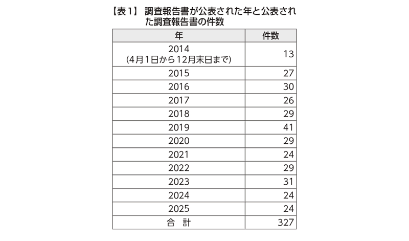 今回調査の対象としたのは、2014年4月1日から2025年12月31日までの期間に、不適切な会計処理(粉飾決算)や元役員、元従業員らによる不適切な行為等について第三者委員会報告書(第三者を含んだ社内調査委員会報告書を含む)を公表した企業(以下、「報告書公表企業」という。)である。これまでは、年によって多少の増減はあるものの、年間にほぼ30件程度のペースで不適切な会計処理等に関する調査報告書が公表されてきている(表1を参照。)。なお、調査報告書が公表された事例のうち、得意先が要求する性能やスペックを満たしていない製品を偽って納入していた等の、会計処理とは直接関係しないような不適切な事例は、今回の調査の対象からは除いている。