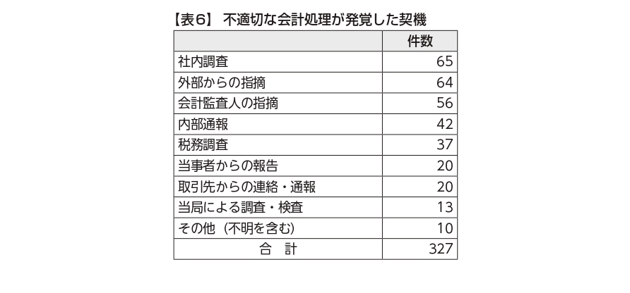 一つの不適切な会計処理の事例の中に、表5の項目が複数含まれることはよくあり、むしろそのような事例のほうが多いが、ここでは便宜的に、それぞれの事例をどれか一つの項目に分類している。最後に、不適切な会計処理が発覚した契機を分類すると、表6のようになった。