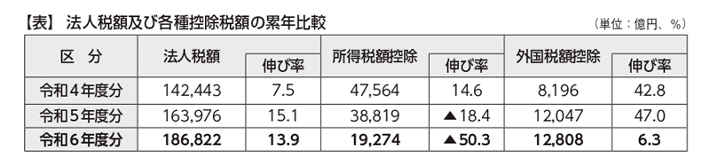法人税額は18兆6,822億円(前年度比+2兆2,845億円、同+13.9%)と4年連続で増加しており、過去最高を記録した。また、所得税額控除は1兆9,274億円(同▲1兆9,545億円)と、前年度の約半分となった(表参照)。国税庁によると、令和4年度税制改正により、完全子法人株式及び発行済株式の3分の1超を有する株式等のうち、自己の名義をもって有するものに係る配当について源泉徴収が不要となっており、本年度分から全ての調査期間に適用されたことで大きく減少したものとしている。