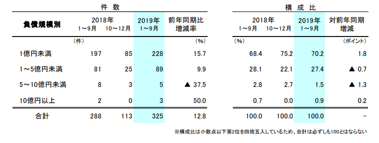 負債規模別件数をみると、2019年1~9月累計は負債「1億円未満」が228件と、前年同期比15.7%増加し、構成比は7割超を占め突出している。