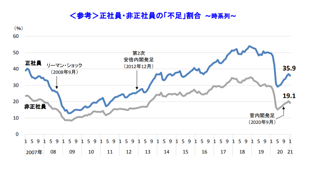 ※調査期間は2021年1月18日~31日、調査対象は全国2万3,695社で、有効回答企業数は1万1,441社(回答率48.3%)。なお、雇用の過不足状況に関する調査は2006年5月より毎月実施しており、今回は2021年1月の結果をもとに取りまとめた。
