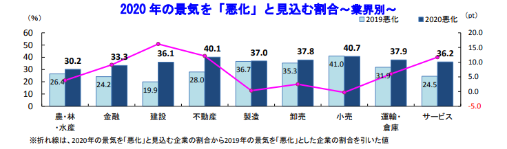 「悪化」局面を見込む企業を業界別 にみると、『小売』が 40.7%でトップ、 次いで『不動産』(40.1%)も同じく 4 割台で続いた。また、本調査で 2019 年の景気を「悪化」局面とした企業の 割合と 2020 年の景気を「悪化」局面と見込む企業の割合を比較すると、『建設』や『不動産』、『サ ービス』で 10 ポイント以上の増加がみられた。企業からも「東京五輪関連の投資が終わり、観光 もピークを迎え、悪化局面に入る」(木造建築工事、北海道)や「地域の不動産業においては、復 興特需の反動で低迷期に入ると思われる」(不動産管理、熊本県)といった声や「現状はキャッシ ュレスポイント還元などにより、消費税率引き上げの影響は小さいとみている。しかし、2020 年 6 月までの限定的な動きであり、その後は下落幅が大きくなると予想する」(化粧品小売、東京都)
