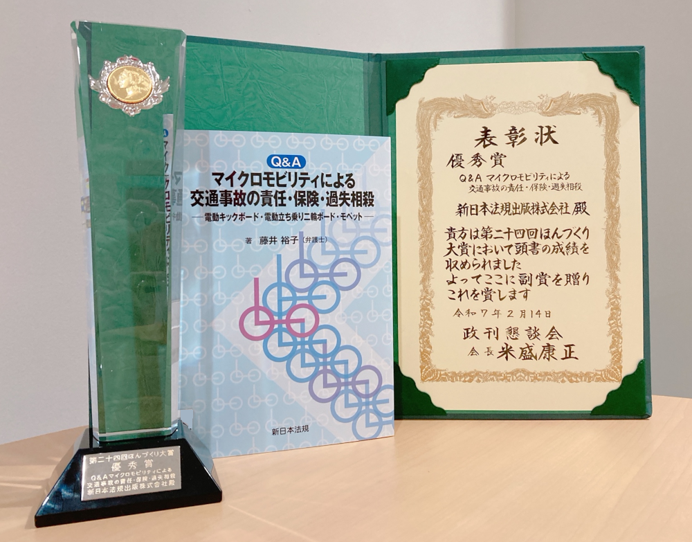 政刊懇談会主催の第24回ほんづくり大賞において、新日本法規出版の「Q&A マイクロモビリティによる交通事故の責任・保険・過失相殺 -電動キックボード・電動立ち乗り二輪ボード・モペット-」(著/藤井裕子(弁護士)、2024年10月発行)が「優秀賞」を受賞しました。