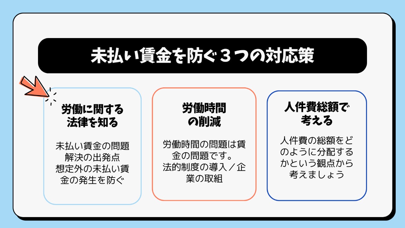 ➀ 法律を知り想定外の未払い賃金が生じないようにする