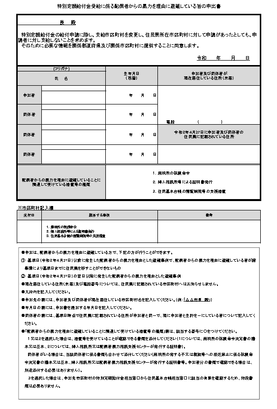 「特別定額給付金受給に係る配偶者からの暴力を理由に避難している旨の申出書」の様式はこちら