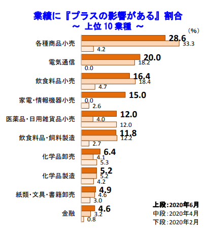 また、プラスの影響を見込む企業は毎月微増する傾向にある。特に在宅時間の増加にともない、食料品や電気通信などを取り扱う企業では、需要の拡大を実感していた。
