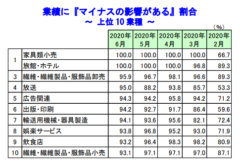 さらに、業種別にみると、「家具類小売」は4カ月連続、「旅館・ホテル」は3カ月連続で100%となった。以下、「繊維・繊維製品・服飾品卸売」(95.9%)、「放送」(95.0%)、「広告関連」(94.3%)が続いた。特に、「旅館・ホテル」や「飲食店」などの4業種では5カ月連続で企業の8割超が業績にマイナスと見込んでいた。企業からも「営業努力によって需要の回復を図るには限界があるので、消費意識の早期回復を望む」(旅館、新潟県)や「従業員の雇用を守り、生活を守ることに主眼を置きたいが、非常に厳しい状況である。旅行業、観光業、飲食業などが大きな影響を受けているが、他業種から理解されていない」(一般食堂、三重県)といった意見が聞かれた。