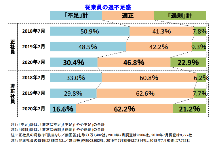 ※調査期間は2020年7月16日~31日、調査対象は全国2万3,680社で、有効回答企業数は1万1,732社(回答率49.5%)。なお、雇用の過不足状況に関する調査は2006年5月より毎月実施しており、今回は2020年7月の結果をもとに取りまとめた。
