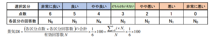 DI(ディフュージョン・インデックス〈DiffusionIndex〉)は、企業による7段階の判断に、それぞれ以下の点数を与え、これらを各選択区分の回答数に乗じて算出している。