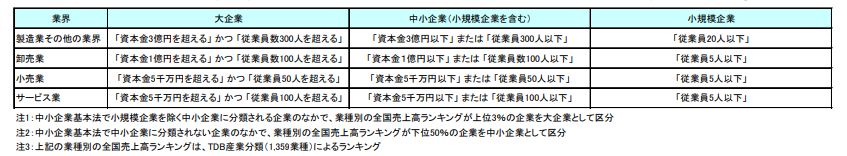 企業の多様性が増すなか、資本金や従業員数だけでは計りきれない実態の把握を目的に中小企業基本法に準拠し、全国売上高ランキングデータを加え下記の通り区分している。