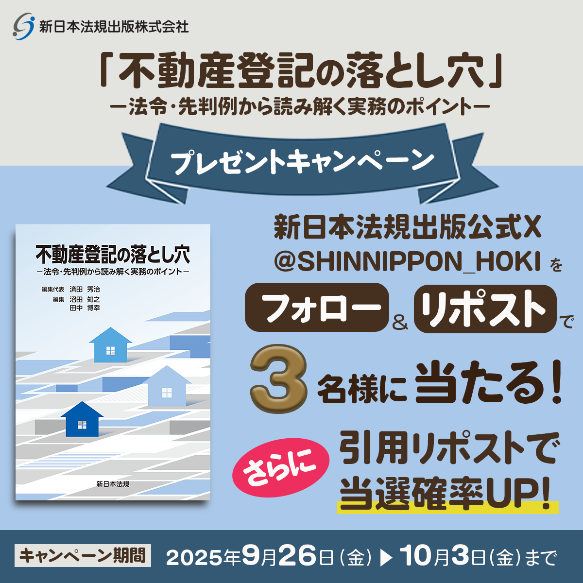 新日本法規出版株式会社(以下「当社」といいます。)が主催する、X(旧Twitter)キャンペーン(以下「本キャンペーン」といいます。)に応募いただく前に、本規約をよくお読みいただき、同意の上ご応募ください。