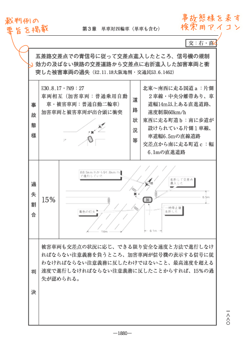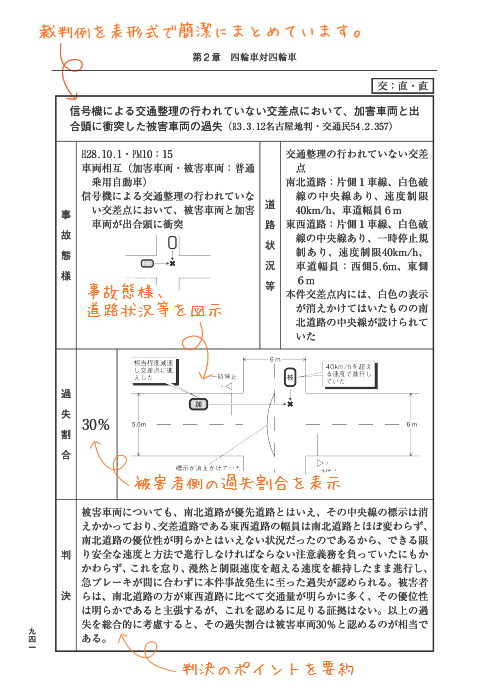 ◆事故状況を分かりやすい図で表示し、過失割合と判決のポイントを簡潔にまとめています。