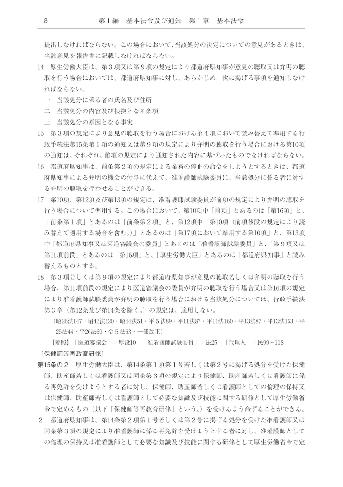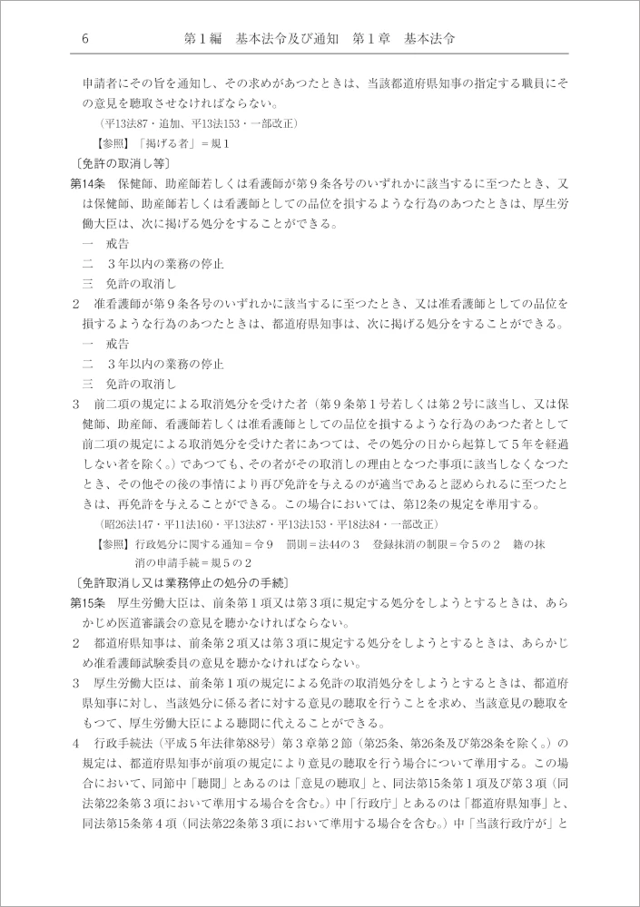 ◆「保健師助産師看護師法」「看護師等の人材確保の促進に関する法律」には、それぞれの条文末尾に、関係する定義・罰則等を定めた規定の条数を明示した【参照】を掲載。